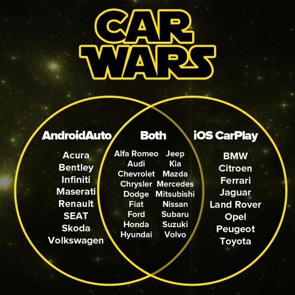La rivalidad entre Google y Apple llevada a los sistemas operativos para el automóvil llega hasta tal punto que algunos, como la web @somospostpc en elaboran imágenes que cuelgan en su twitter hablando ya de una guerra de los coches entre ambas empresas.